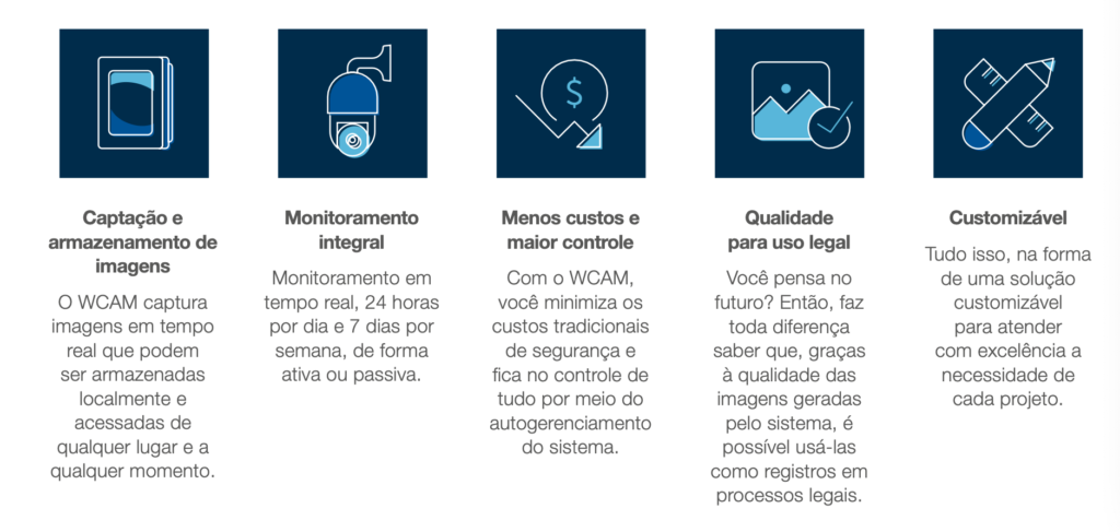 Composto por câmeras, gravadores e complementos, o WCAM é uma solução que leva a confiabilidade e a segurança da marca WEG, uma das maiores fabricantes de equipamentos eletrônicos do mundo.